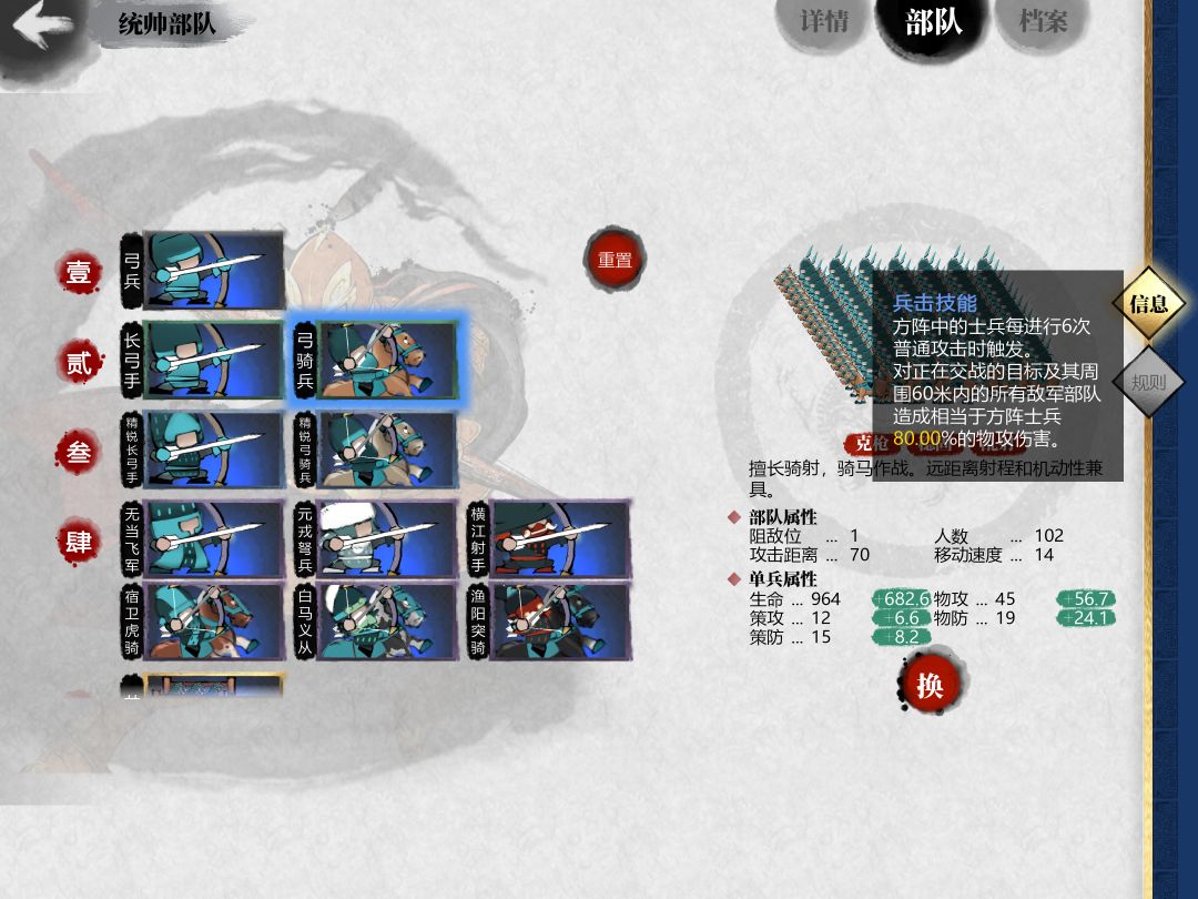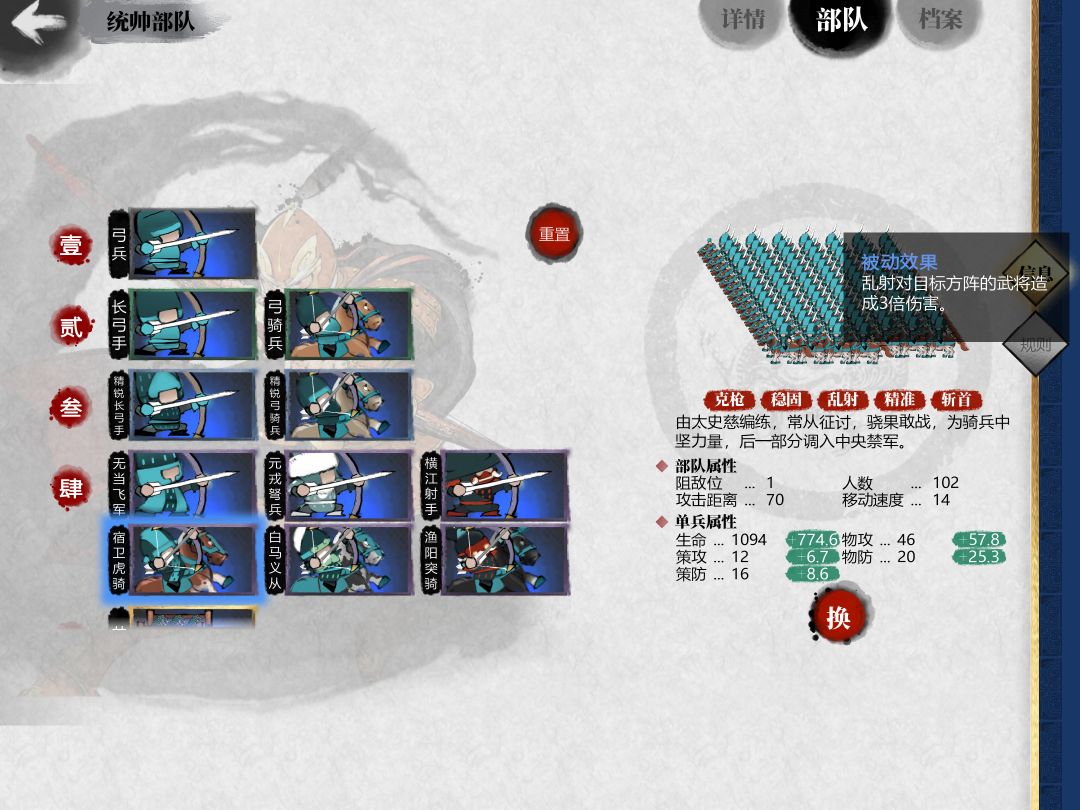 4.1.当同行只有1个弓兵方阵时,宿卫优于白马。