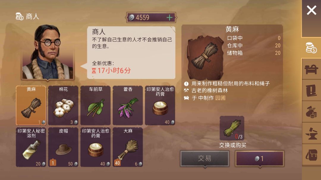 5级木头和5级石头可以在城镇交换,5级草和5级兽皮可以在东南部商人那里交换,5级矿石可以在印第安定居点的商人交换。