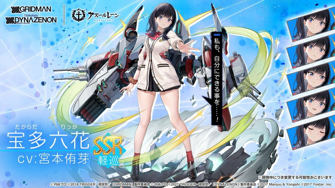 来自《SSSS.古立特》和《SSSS.电光机王》中的七名角色将化身舰娘来到《碧蓝航线》中,并且在联动期间,每位角色都拥有新换装可供购买。
