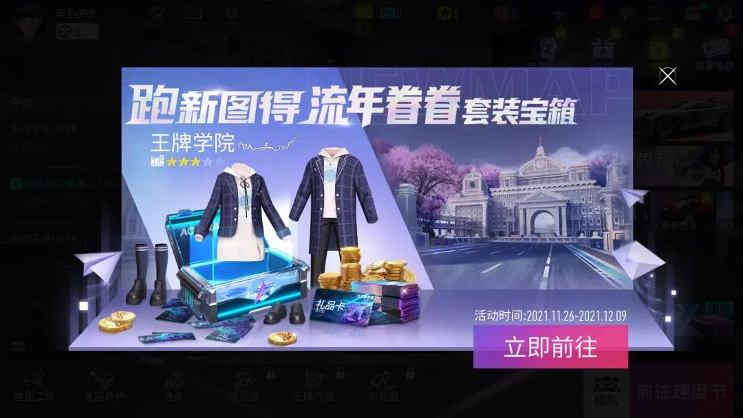 2021.11.26-12.09,每日参与【新图揭幕】活动完成新图挑战任务即可获得新图积分,兑换王牌赛车学院宝箱、新图钥匙、礼品点等丰厚奖励,更有概率免费获得全新时装“流年眷眷”!