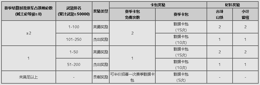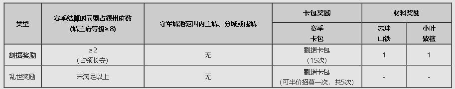 本赛季以同盟为单位进行结算,在赛季结算时根据同盟占领的州府数量、势力在城池范围内拥有主城、分城或戍城作为赛季奖励的评判依据。