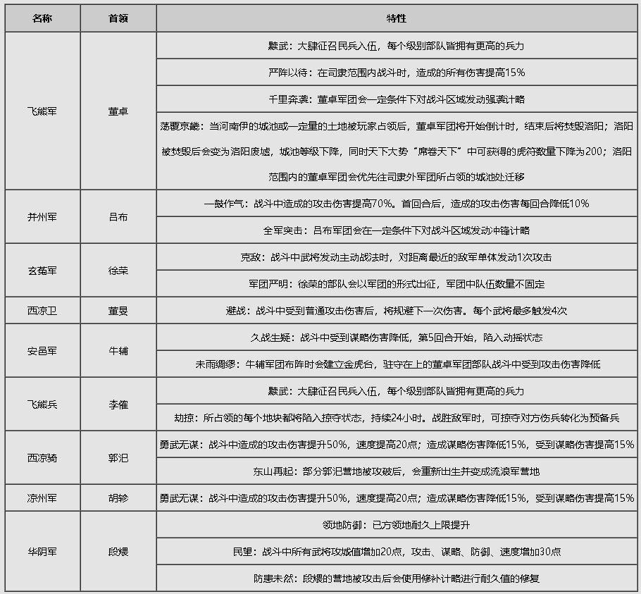 九大军团由不同武将带领,由于其首领的不同性格,每个军团也各有特色。