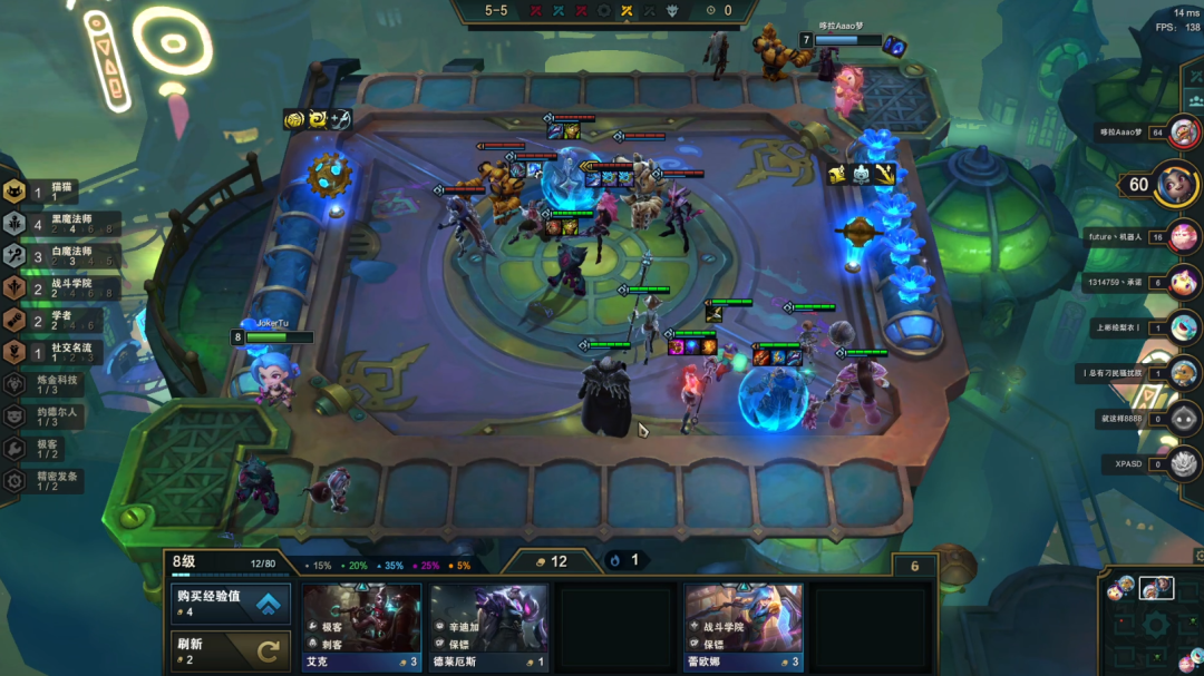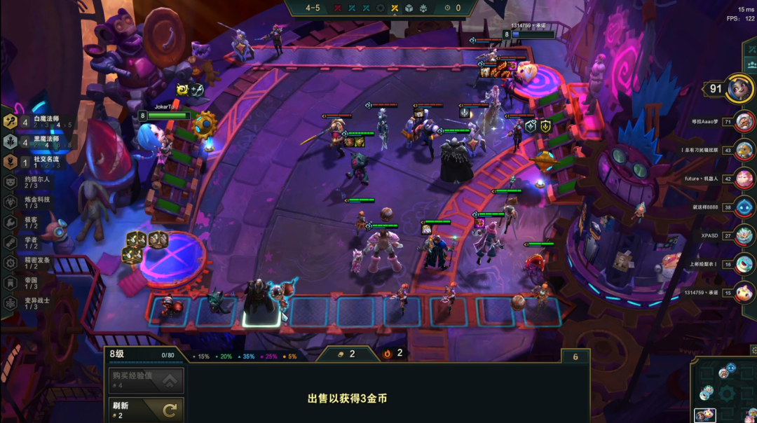 没花太多钱4-5可以直接跳8人口,手上20多块直接D完,凑齐4黑法3白法2学者,也可以先4白,拉克丝没2星不着急上,秒不掉刺客和永恩没啥用,不如蚂蚱磨。