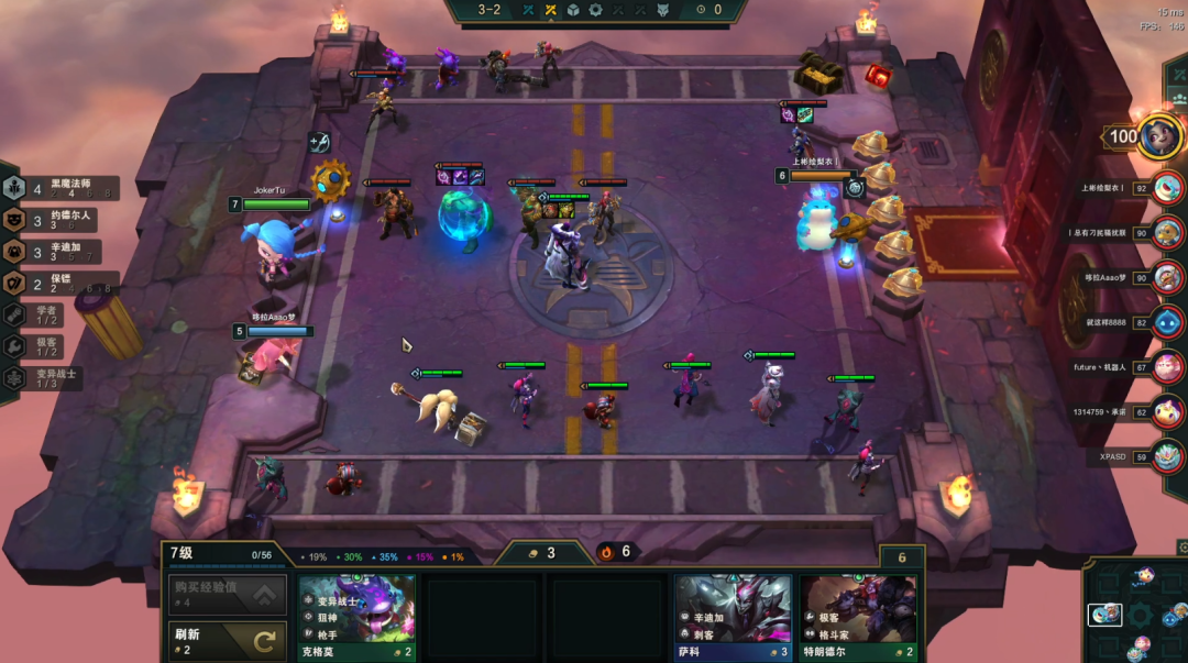 3-1跳6人口,3-2跳7人口,只要你利息的平衡和约德尔的应用是正确的,而且不是1胜1负经济稳固,那么3-2全部钱花完正好可以跳7人口, 保证可以继续挂约德尔白嫖,并且场面强度最大化,并且有效的嫖一些高费的白法,主要目的还是最大概率薇古丝和蚂蚱,这两个2星中期就稳了,法师体系现在45费没那么重要,先把卡特和未成形的永恩干废才是重点,逼着他们4-1梭哈,不出2星永恩就78走人,除了也压制容错让他们不天胡尽可能345,也逼迫卡特的空间,让他们尽早梭哈,降低整体三星刺客的数量,把不成型的毒瘤直接干到78去,法师体系内因为有约德尔白嫖薇古丝,而且只需要3费2星,吃分的能力远远大于其他阵容。