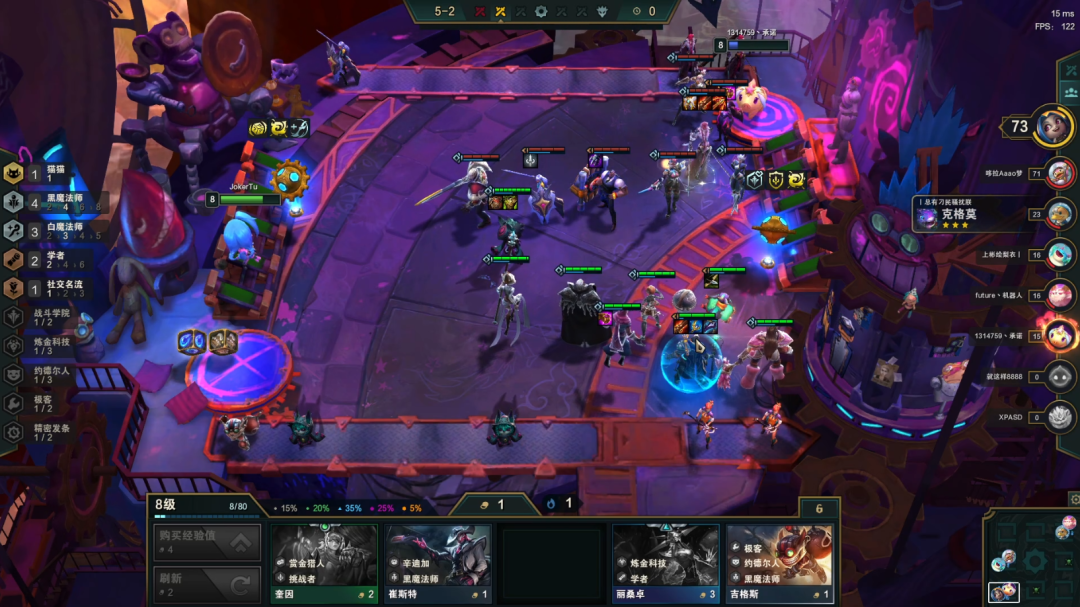 版本的节奏非常的快,前期要疯狂的压制,即使疯狂压制中期也可能会被刺客断,但是法师不是很怕同行,因为约德尔能白嫖,2星薇古丝就能锁,不吃主C位,同样质量不怂永恩,版本节奏快到永恩不天胡2星,4阶段结尾或者5阶段初就走了,5-3就剩下5家了,而且只有刺客、法师、永恩和其他天胡,法师作为中节奏是最占便宜的。