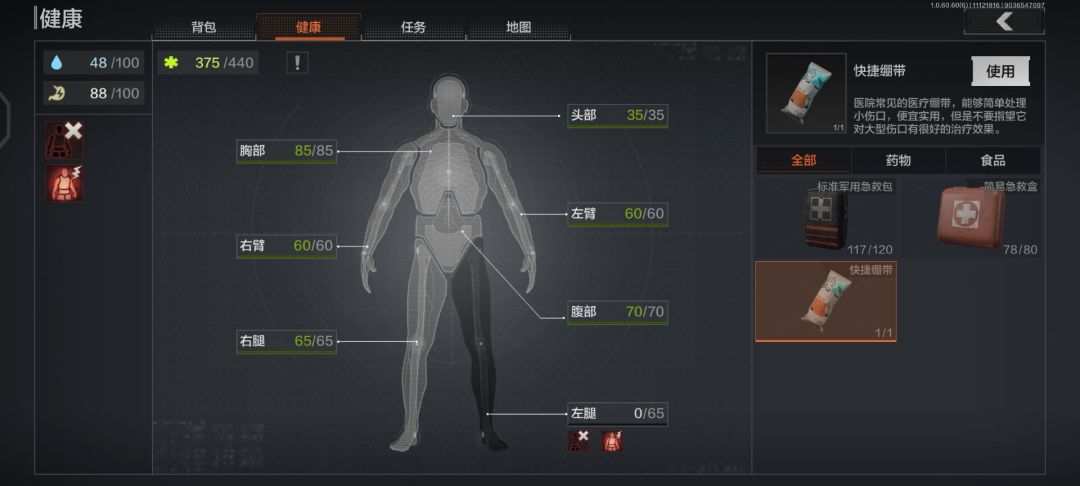 游戏当中拥有人物肢体伤害的添加可以说这个基本很多游戏没有,或者没有像这款游戏添加了那么多的身体状态,虽然游戏对于治疗进行了一些简化但是部分地方该有的都有,有的时候腿部治疗不了只能止疼药来让我们人物能继续奔跑,其他部位都是一样能影响听力控制枪械后坐力视力等等,这都是这款游戏来靠近真实的设计方式。