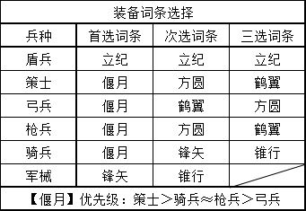 策士、弓兵、枪兵、骑兵,四个兵种的首选词条都是偃月。由于策士克制盾兵,所以优先给策士;其次给高攻的枪兵和骑兵;弓兵被盾兵克制,最后给弓兵。