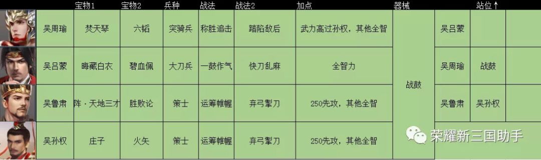 孙权:队伍工具人,主要就是套buff套盾保护周瑜,不过因为有阵·天地三才的弓兵效果,加上本身的恢复效果,可以说有了足够的生存能力,可以放到单路小抗一下伤害队伍变种这套阵容比较极端,唯一能替换的就是孙权换孙坚了,装备方面就有周转的空间了,比如没火矢就用奇策,没六韬就用飞景剑or棋盘增加点杀能力,另外周瑜不转骑也可,下掉三才换别的装备,位置建议放中间,现在三保一吕布队太多了。