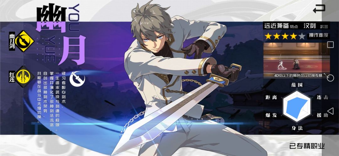 蓬莱夜刃有两类专精,一类是红莲,一类是幽月剑。幽月剑非常均衡,但是同时也有很高的操作难度。