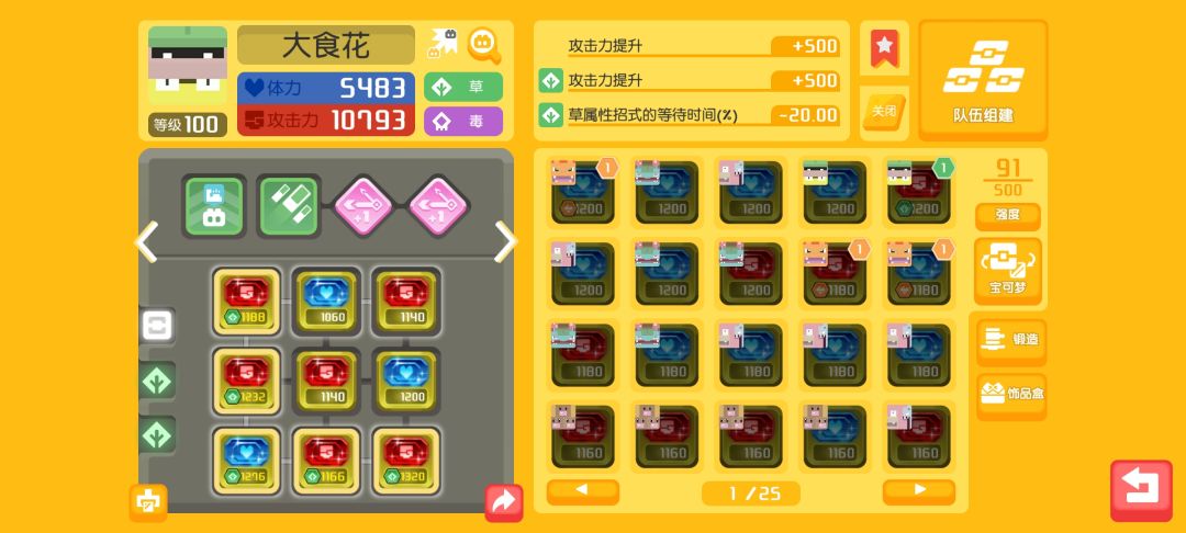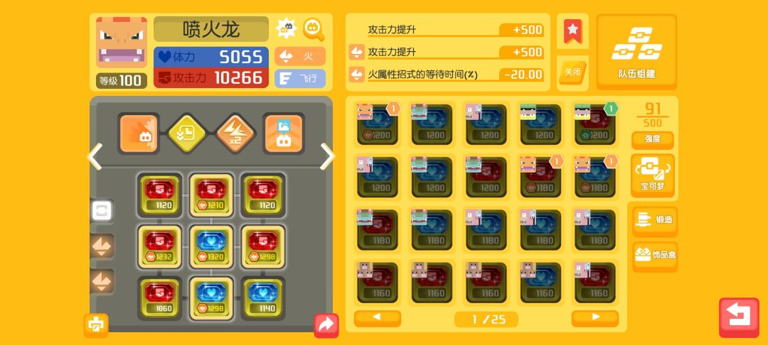 然后我打后面需要在3w战力以下的时候,首推妙蛙加喷火龙,因为真的很暴力,火龙比较吃吸血buff,这个模式石头的吸血加成到0.9就差不多可以满足自己回复了。