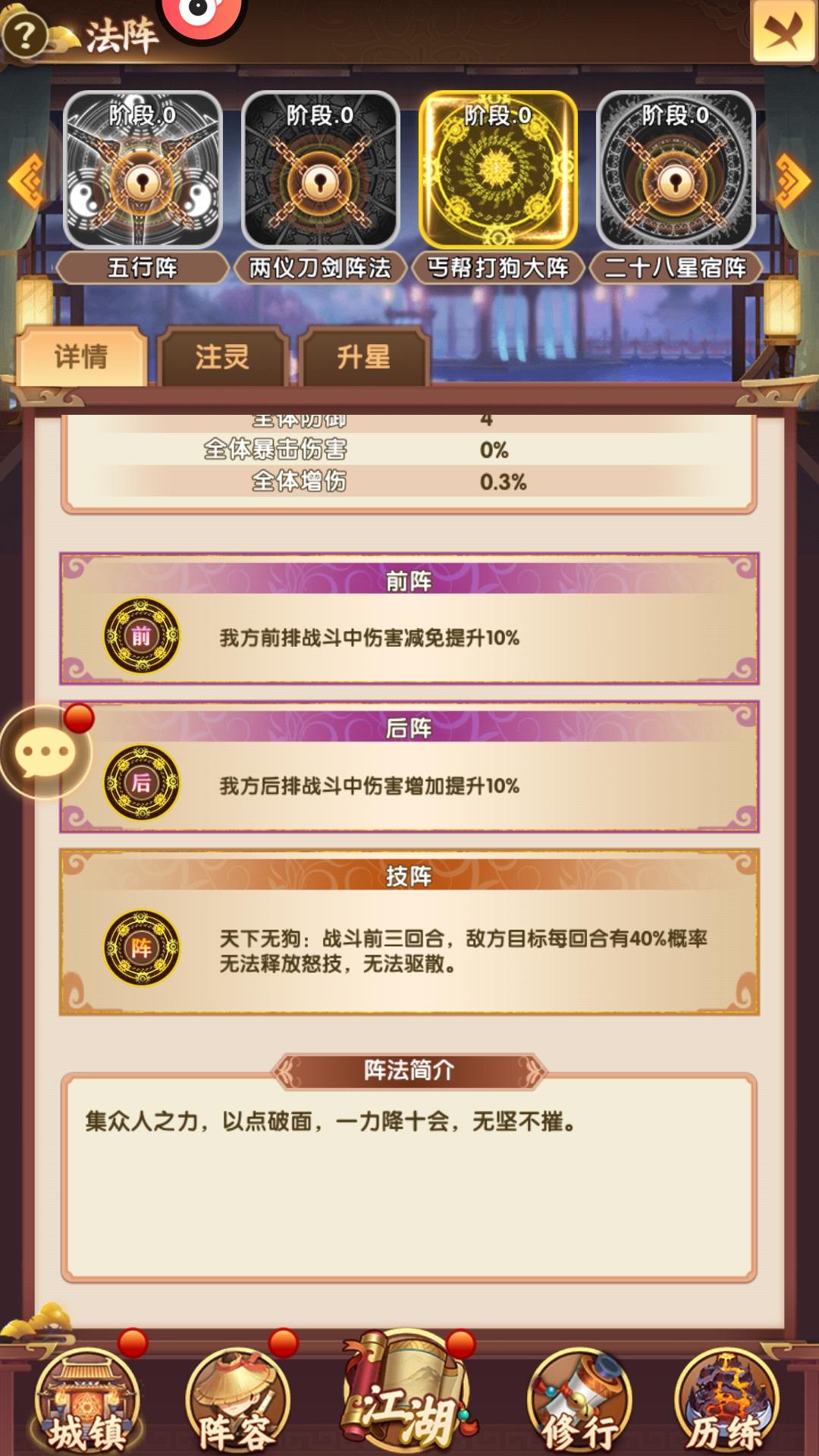如图所示,该法阵穿戴时能够为前排减伤10%、后排增伤10%,并且敌方目标"前三回合每回合40%的概率无法释放怒气技能,无法驱散"。