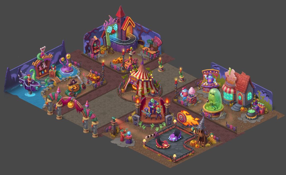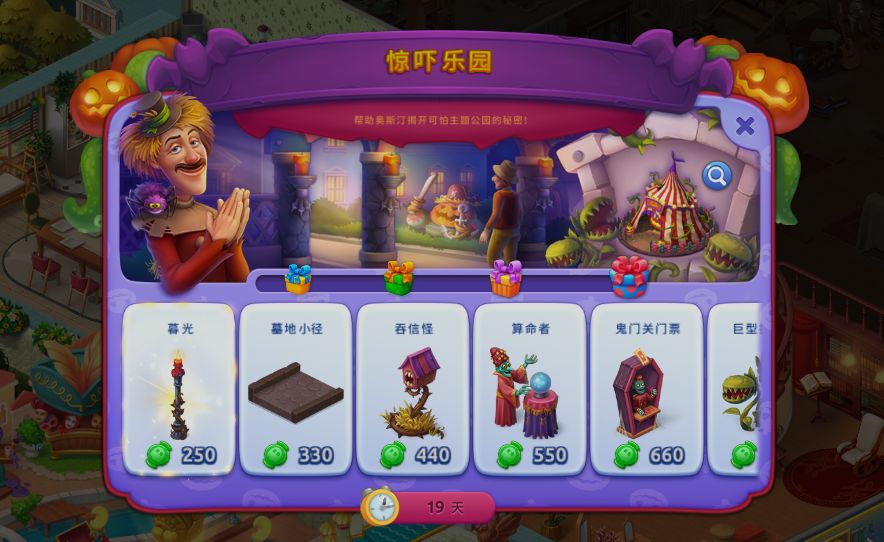 活动玩法:闯关收集南瓜,兑换恐怖游园会主题皮肤,打造全新风格的家园~鬼里鬼气的游乐场,等你噢