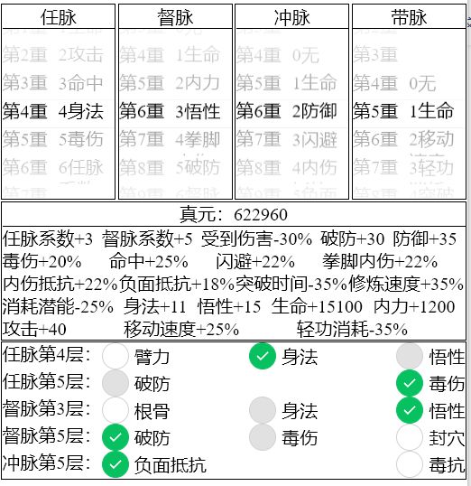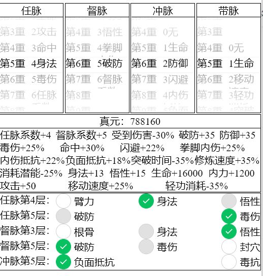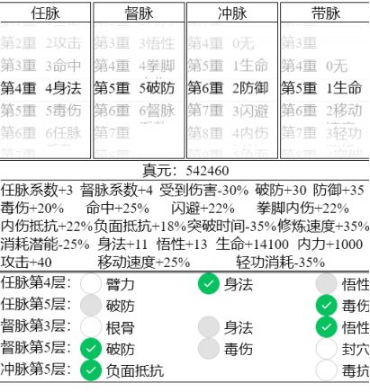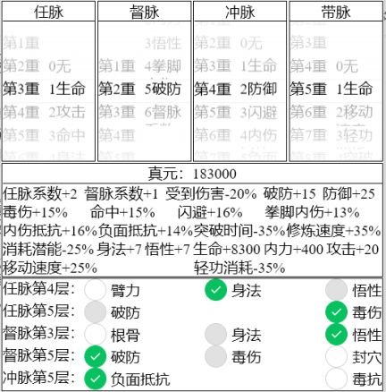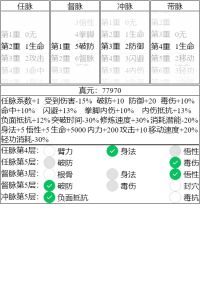 2. 假如你是一轮你肯定好奇多少真元比较好,那么这里用发育+pk综合来看,三级带脉是非常常规的开局,搭配3级防御,1-2级的任脉和督脉,能起到不错的发育及pk效果。还是谨记:400基础减法才能学九剑,意味着有一段时间要挨打的!