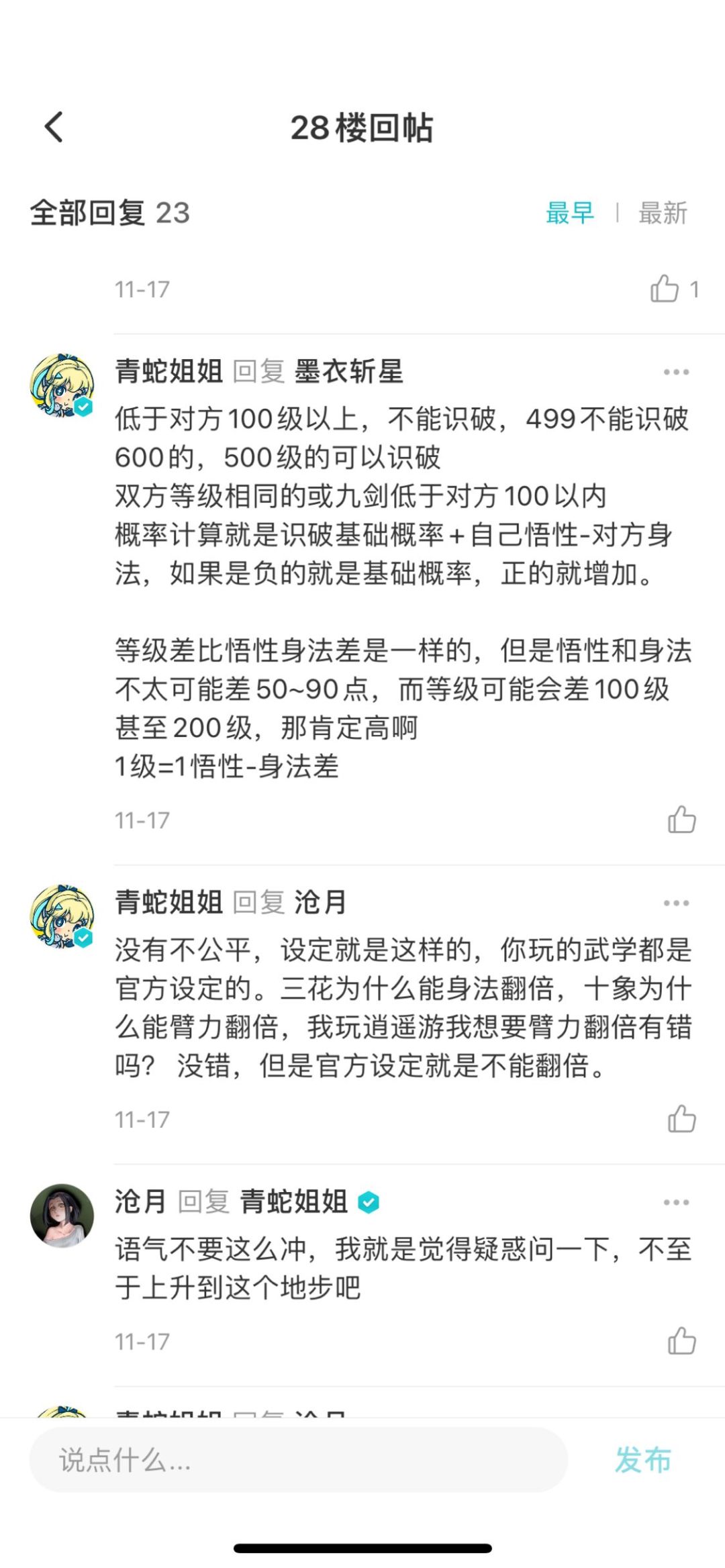 识破机制:基础识破概率(不清楚)+悟性比拼当前身法(受三花和菊意影响)+等级比拼(100级差距以外不触发识破)