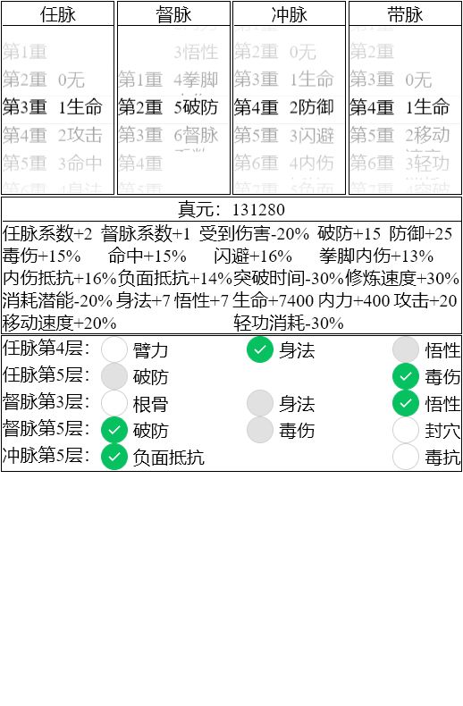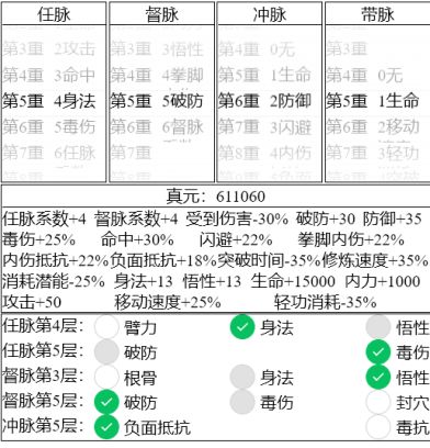防御不变,任脉督脉多加少点区别不大(决定输出~但是pk中输出比不上冲脉的加持)
