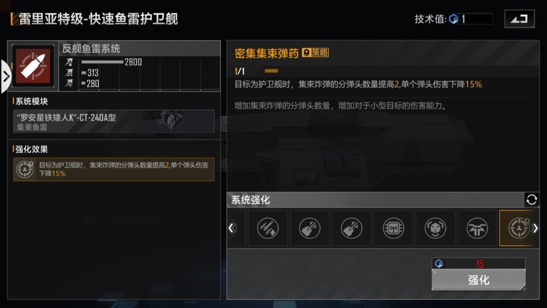 主武器策略方面,雷里亚特对舰型攻击目标为护卫舰时弹头数量才会提高2,伤害下降15%,在护卫舰内战的时候还是相当好用的,比如开局的前三天,在大规模生产、使用巡洋舰之前,护卫、驱逐作为舰队主力时,雷里亚特对舰型输出还是比较给力的,但是前期很少打架,所以显得也不是那么实用。