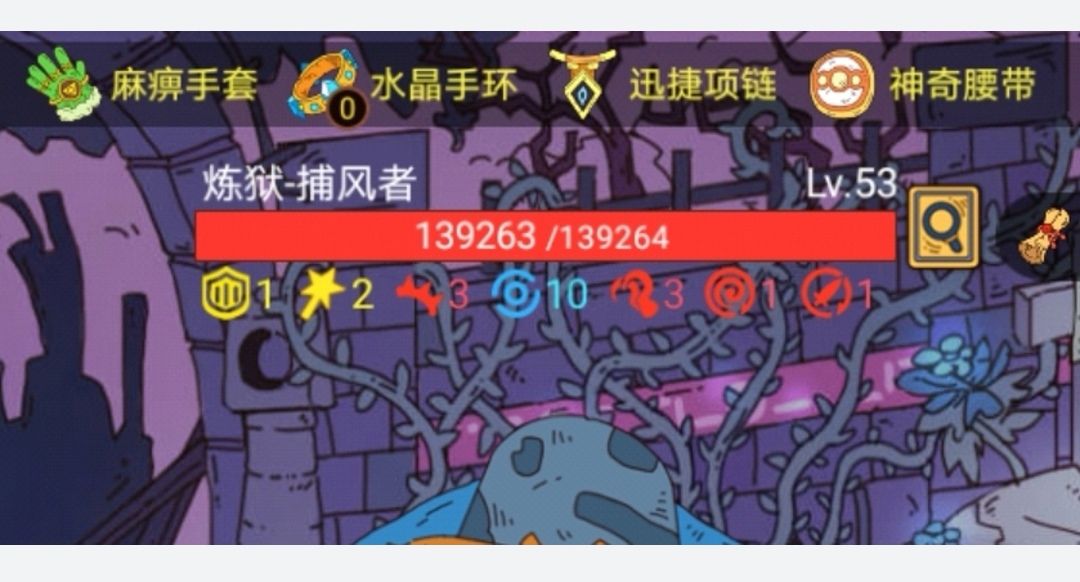 打法:如果能绕过这个怪,就一定要绕,如果绕不过去,前5回合尽量认怂,打不死的,能堆防御就不要打输出。这个怪还好伤害也不是很高,第一回合用蘑菇帽规避伤害,后面根据英雄的配置搭配