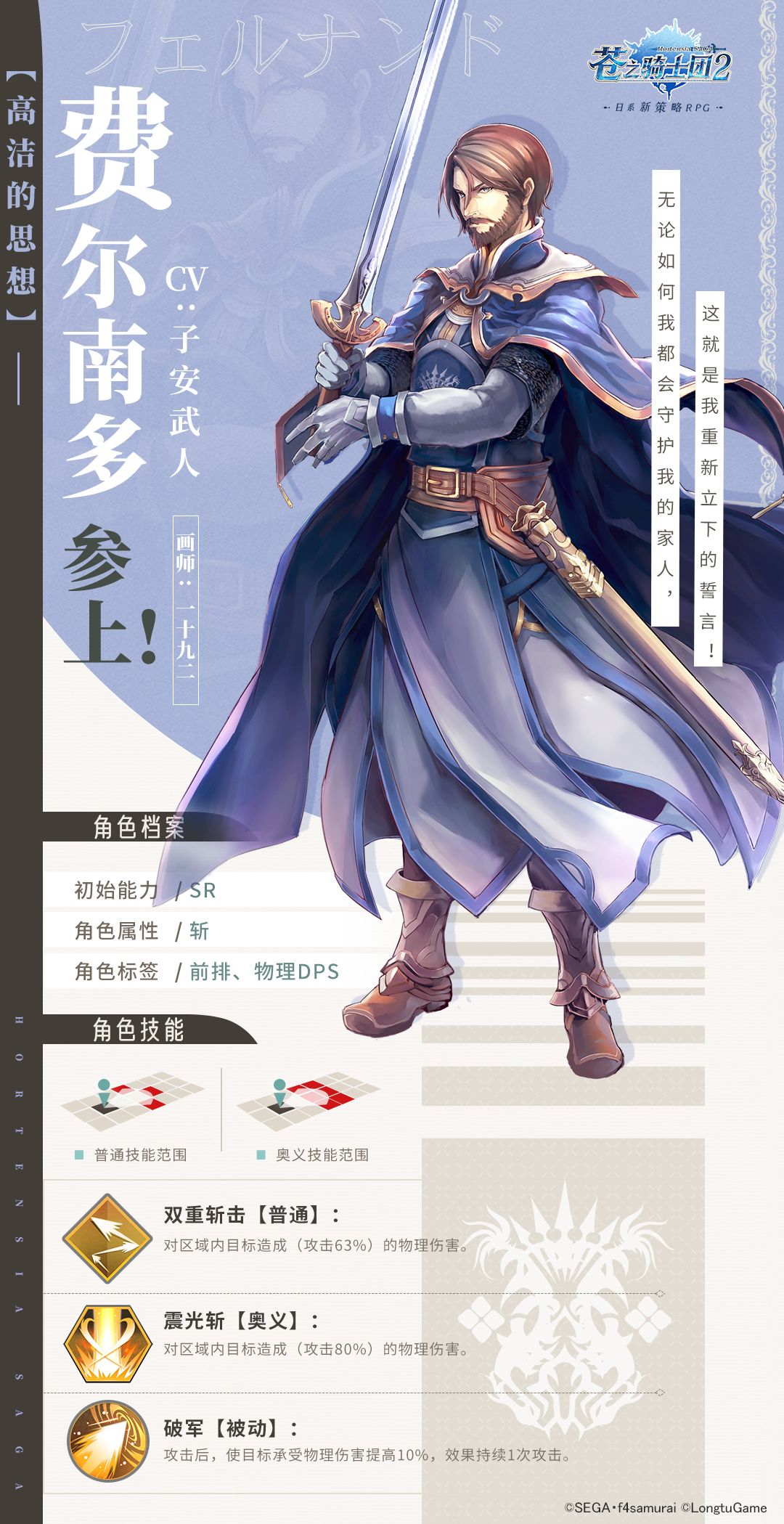 前神殿骑士费尔南多,是游戏中主人公的父亲,也是鲁基司叛乱的“牺牲品”之一,悲惨的命运令人唏嘘。不过在游戏里,我们还是可以操控这位正直、刚毅的神殿骑士,用他的力量为主人公的逆袭之旅护航。