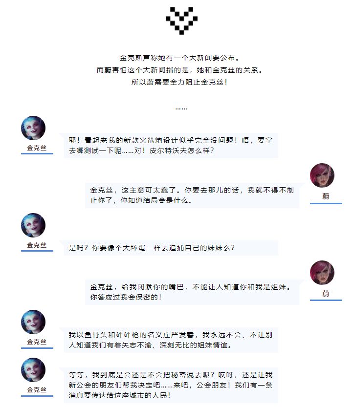 而蔚并不想让自己和金克丝姐妹的身份被曝光,不然就会有许多的麻烦找上门,而金克丝正是抓住了这一点以此来威胁蔚!干得好,各位!我们成功地吸引了他们的注意力。这地方到处都是晃荡的守卫,就跟……呃……就跟没头的苍蝇一样。好了,现在皮尔特沃夫的民众都在看着!我想,是时候给他们奉上一场惊喜表演了!比如,向他们揭晓点祖安的秘密……或是什么人之类的。金克丝用挑衅的语言向蔚说着!但她不知道如果说出去,会造成什么麻烦!