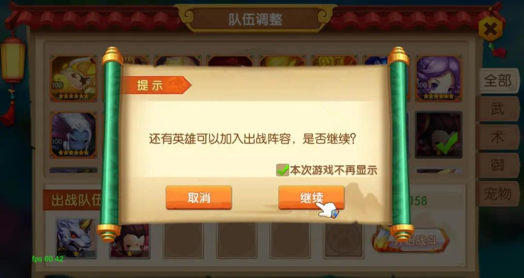 08队伍上阵人数询问优化队伍上阵人数询问优化,新增不在询问选项。点击选择,直接进入,让进入战斗界面更清爽。