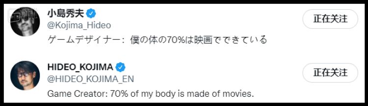 如果你是一名关注小岛秀夫推特的玩家——我是指确实地在推特上“关注”了他,而非通过国内媒体或者QQ群截图来间接获知他的动态——那么想必早就发现了一件事:在推特上有两个小岛秀夫。