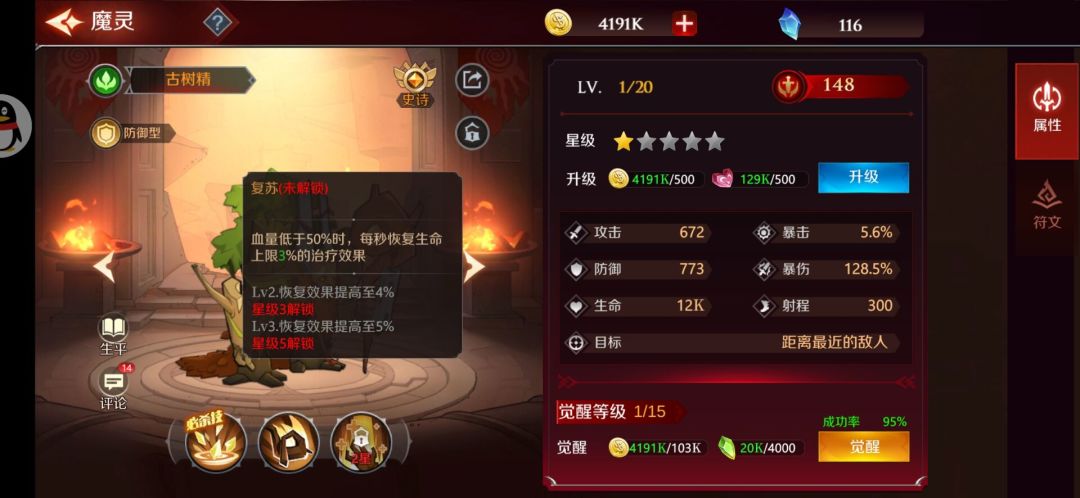 古树精的大招是对周围敌方造成130%伤害,还能反弹敌人20%伤害,算是中规中矩吧,那为什么还说他是神卡呢,因为他的三技能被动,生命低于50%,每秒恢复自己生命的3%【最高5%】,这个技能还是持续的,所以这个被动让古树精的续航能力超级强,基本配上治疗卡,就是不死的存在,古树精属性主堆生命防御。肉就完了。
