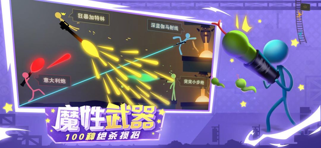 《逗斗火柴人》武器系统丰富、功能强大、花样繁多,从现实世界的冷热兵器,科技感十足的时间手枪、光剑,再到“杀敌一千自损八百”的粘性胶枪、黑洞枪,玩家能够使用各种免费的脑洞大开武器,开启魔性对决。