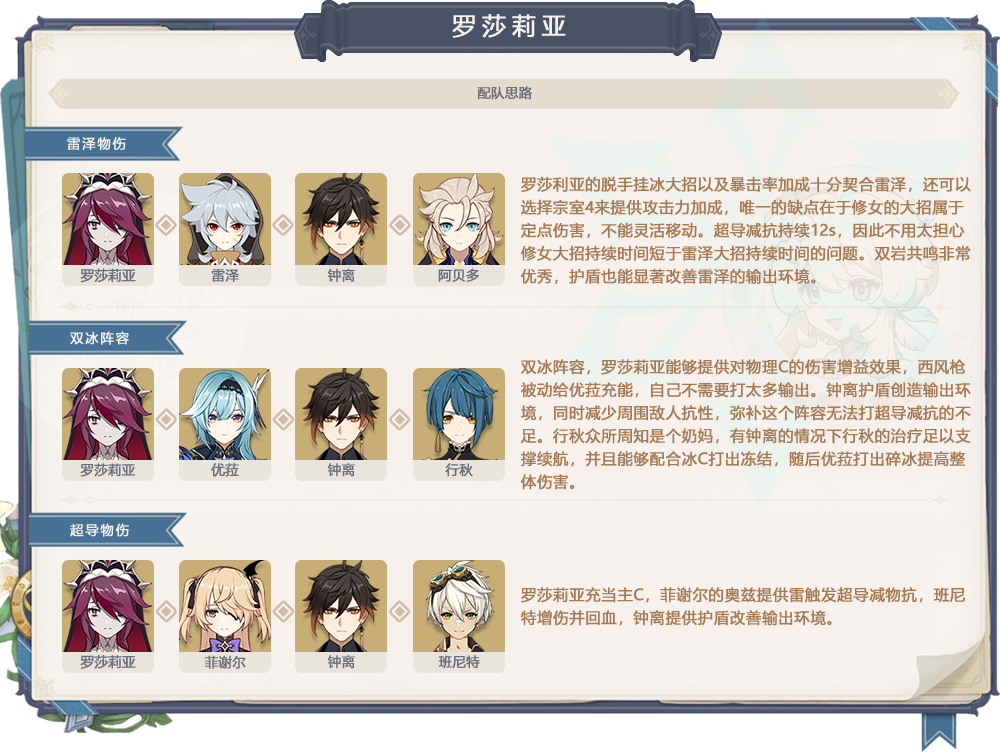 罗莎莉亚目前的主要应用是在物理体系中充当“暴击拐”,自身天赋加暴击并且大招能够提升队伍输出上限,和优菈相性很好。如果有培养物理体系的小伙伴可以考虑抽取。