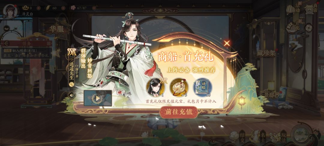 首充礼包包含ssr逍遥先生,5个花诏令和10个诗经。