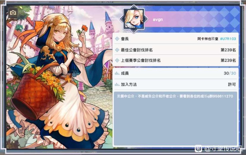 要求1.5e以上,如果box齐全(会战角色齐全),队伍详细参考韩服会战,可以放宽到最低8000w,目前缺4人,动态信息会放下面,排名,满刀肯定前200,如果出刀不积极的也请误打扰(会长不会整天催刀),公会练度,队伍齐全的很多,前百很有可能,可以一起来公会发展,会长个人也是3队齐全,为什么自己开公会也是想体验组织公会,长期发展冲击排名,如果你不想排刀,也想到稍微前排的可以考虑,加公会之前加群(二维码在下面),被吞就搜群号958611270,不加群不会批!