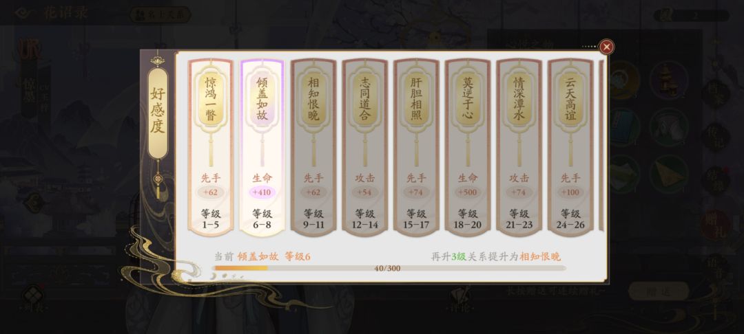 ,包含金叶子,玉佩,称号等礼品,加油提升心仪名士的好感等级吧!