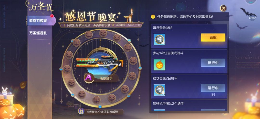 感恩节晚宴活动将于11月25日到12月8日开启,完成任务即可兑换大量金币,最高可得离子炮A级皮肤“南瓜猎手”!