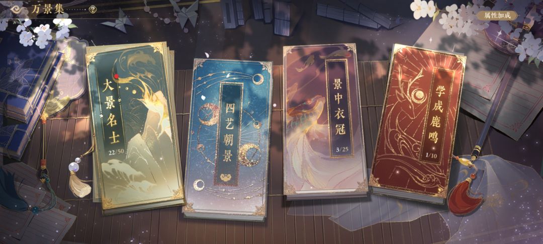 9、万景集中,大景名士、四艺朝景、景中衣冠、学成鹿鸣,分别是卡牌的养成、四艺的搜集、衣服的搜集还有学籍的提升,有红点一定要记得点进去,会有永久的属性加成!