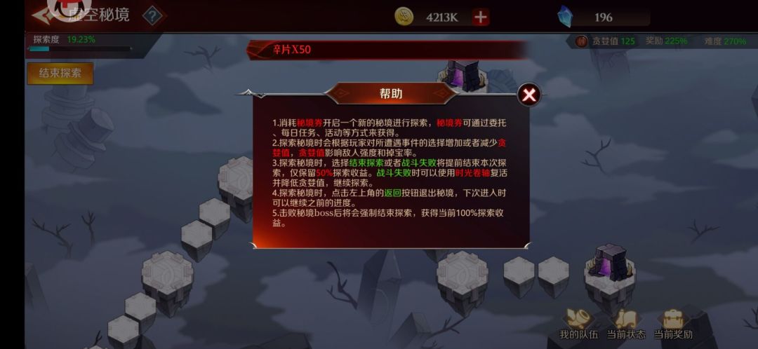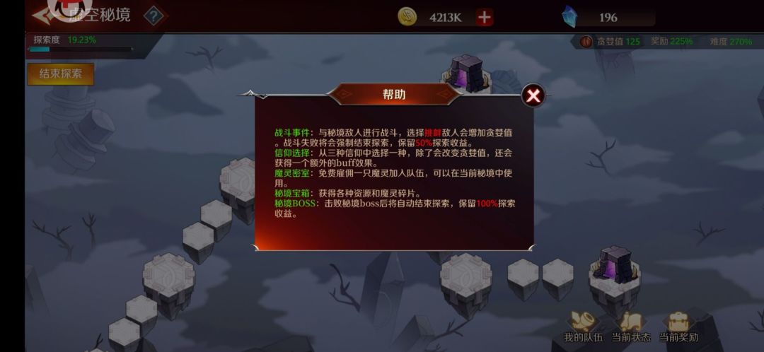 3.探索秘境时,选择结束探索或者战斗失败将提前结束本次探索,仅保留50%探索收益。战斗失败时可以使用时光卷轴复活并降低贪婪值,继续探索。