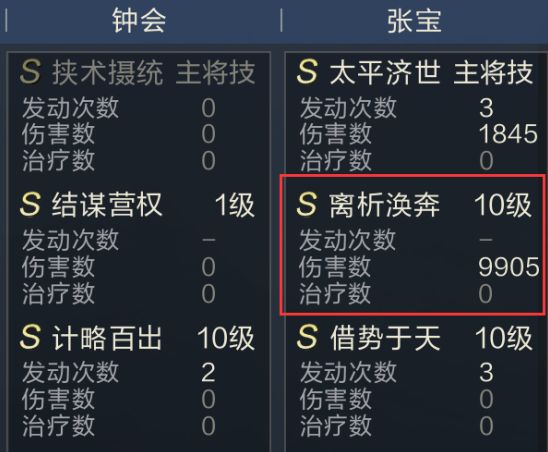 在游戏中我们可以看到,当我方的持续伤害经过转换后,所造成的伤害值会全部计算到“离析涣奔”之下,但经过数次测试可以确认,当我方武将的伤害被转换后,只会计算释放者自身的属性与增益,并非由张宝完成进攻。由此提醒大家在使用SP张宝作为主将时,让SP张宝使用高输出技能,因为他主将技所带来的的神算增益,是无法影响友军的转换伤害的。