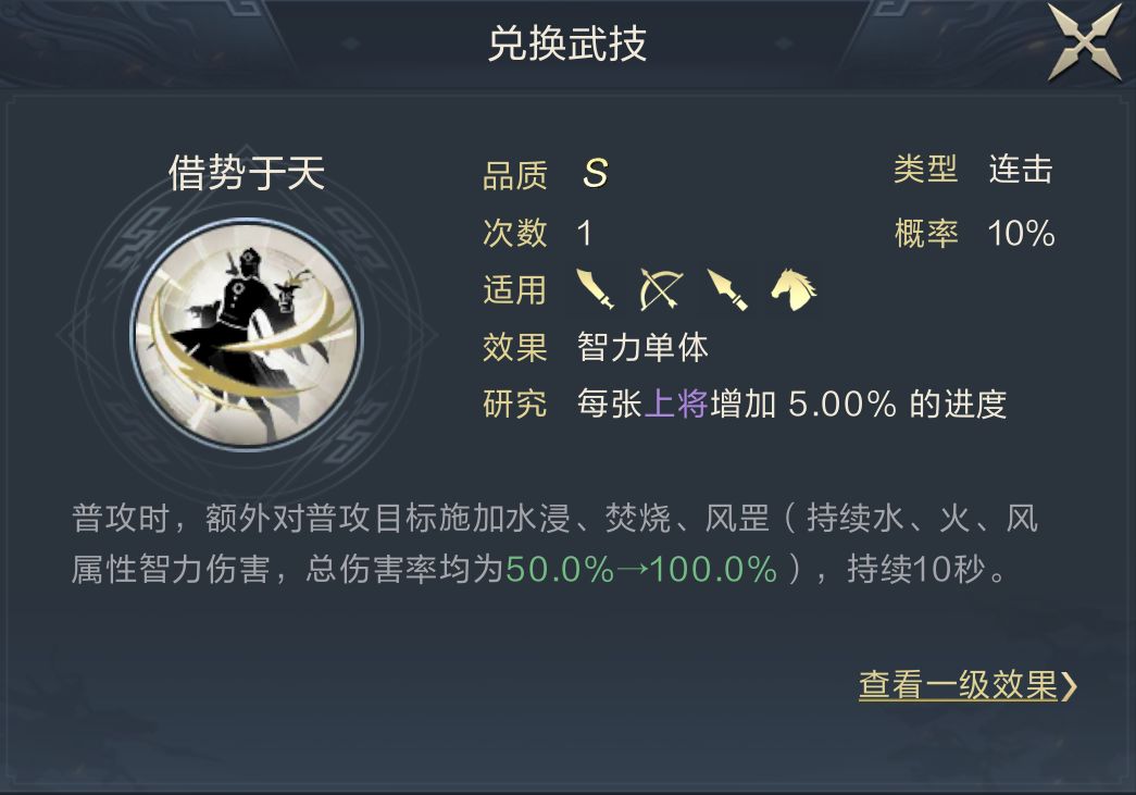 就目前PVP环境而言,常用的前置状态为中毒、雷暴,借势于天虽然总伤害率高达300%,但所拥有的3种状态在常规队伍中并无特殊效果,建议主公将其与SP张宝队伍绑定,将借势于天作为高爆发技能使用。