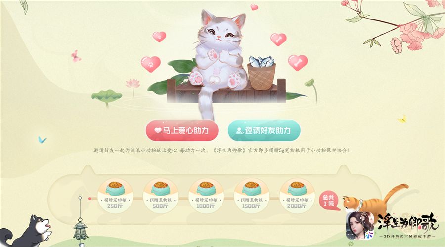 在活动页面,阁下可以参与爱心助力活动,也可以邀请自己的好友一同参与进来,为流浪小动物们献出自己的一份爱心。《浮生为卿歌》官方将会根据玩家们的助力来进行爱心捐赠,每当有玩家助力爱心活动,就将捐赠5克宠物粮作为“苏州小动物保护协会”毛孩子们的过冬口粮,早日达成共计一吨宠物粮的最终目标,保证这个冬天让毛孩子们不再受冻挨饿!