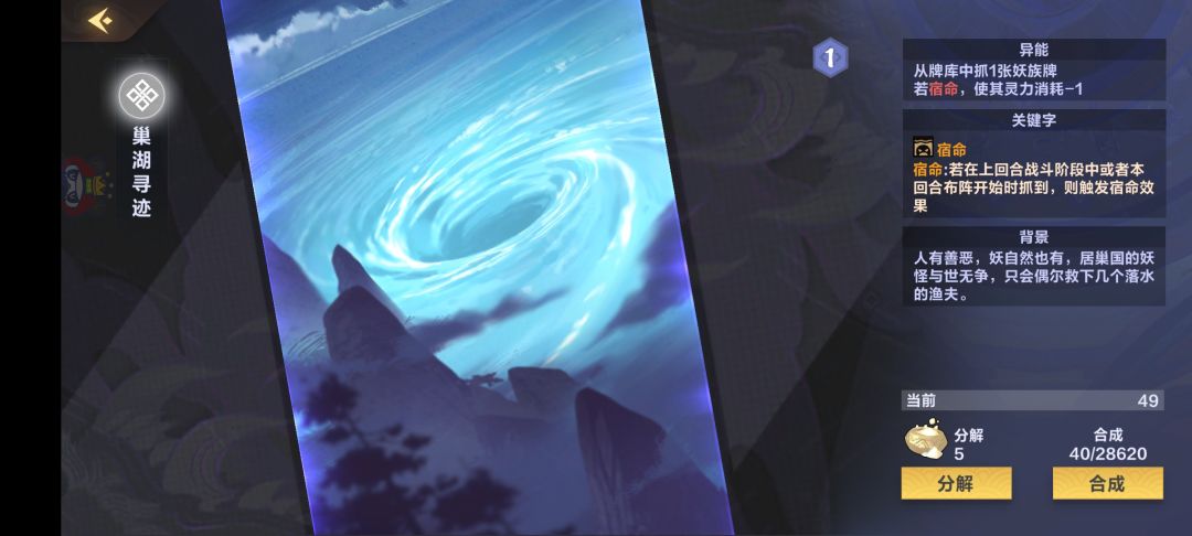 接下来是这两张卡,巢湖和挽弓都是用来固定检索婵幽和丹丘死士的。这也是我这套卡组没有带其他妖族的原因,既然要玩杂技套路,就要把杂技玩到极致!挽弓寻仙3,3费只有丹丘死士一种卡,所以开局如果有这两张卡一定要留!😉