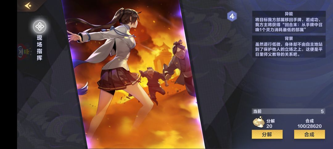 值得说的是现场指挥这张卡,将目标我方部署移回手牌,如果成功,回合末从手牌召唤一个灵力消耗最低的部署。聪明的小伙伴已经明白了,这张卡就是为反复回收婵幽而准备的,这样可以反复降费,让对面只能举手投降。但是这里有一点要注意,那就是当使用这张卡的时候,我们手牌一定要有一张比婵幽费用低的部署在手上才行,否则回手完婵幽,回合末婵幽又被召唤上场,而婵幽的技能是必须要创生才能触发,这样重新被召唤上场的婵幽是不能触发异能的,相当于这回合我们白忙活了。所以,这里要注意,手中没有比婵幽费用低的部署时不要使用现场指挥这张卡。