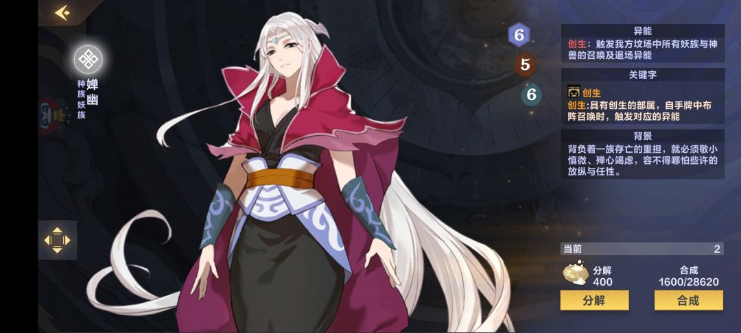 首先核心卡组不用说了肯定是婵幽和丹丘死士了,丹丘死士这卡死亡会让对面减一费,在之前的版本我也见过有玩家用过,但是因为实际效果不大所以这张卡成了名副其实的下水道,因为给对方减一费实在是造成不了多大影响,所以带的人简直屈指可数。但是新版由于婵幽的出现,彻底把这卡救活了,婵幽召唤能触发自己墓地所有神兽妖族的召唤和退场效果,这就相当恐怖了,减一费看不出多大效果,那如果墓地同时存在3张丹丘死士呢?一次性减对面3费,这简直可以称之为降维打击了。而且这还不算完,因为我们还有另外两张卡来继续补强。