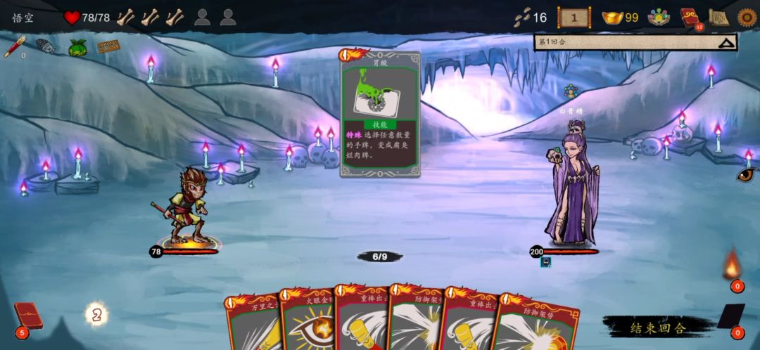 开局四选一,选择 偷天换日。此乃神技也,理论上可以变成任何技能,但最重要的能力之一就是可以变成 探囊取物,在以后的游戏中你越领略就会越觉得强大。但是呢,四选一中让金箍棒变重的第一张牌 千钧之重 也有很多作用。那怎么办呢?打怪胜利后得到的消耗品 探囊爪,或者商店里可能买到的 妙手空空 ,都能帮你偷到这游戏里最简单最暴力的神技 毒(也就是胃酸这张卡,可以让手上任何牌变成0费的腐肉)。