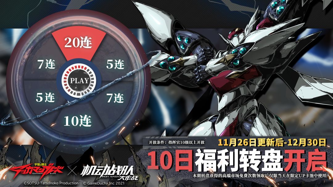 更新后限时登陆转盘活动开启,活动期间连续登陆游戏,即可参与机体转盘活动,转盘持续10日,绑定「铁加曼利刃」机体卡池。