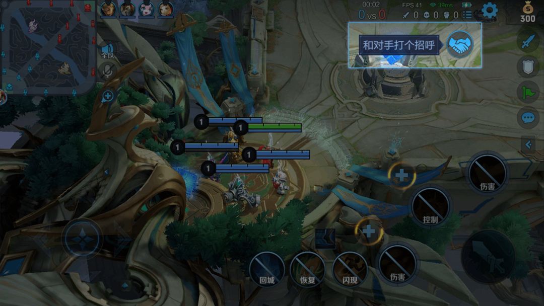 开局之后,当玩家在泉水出生,屏幕右上角会显示握手按钮,点击则会向全体玩家发出对应快捷消息,友好比赛,从开局打CALL开始~