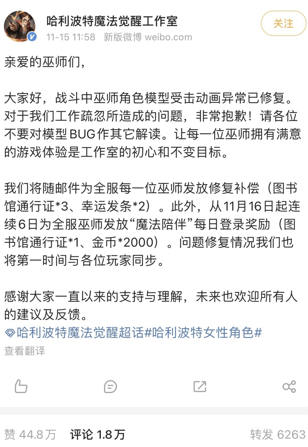 11月15日中午,@哈利波特魔法觉醒工作室表示已经修复了BUG,表达了歉意,并宣布了补偿。但事情并没有就此解决:各个社交媒体上的KOL和用户都开始关注此次事件,甚至还带起了「这不是BUG」的节奏。