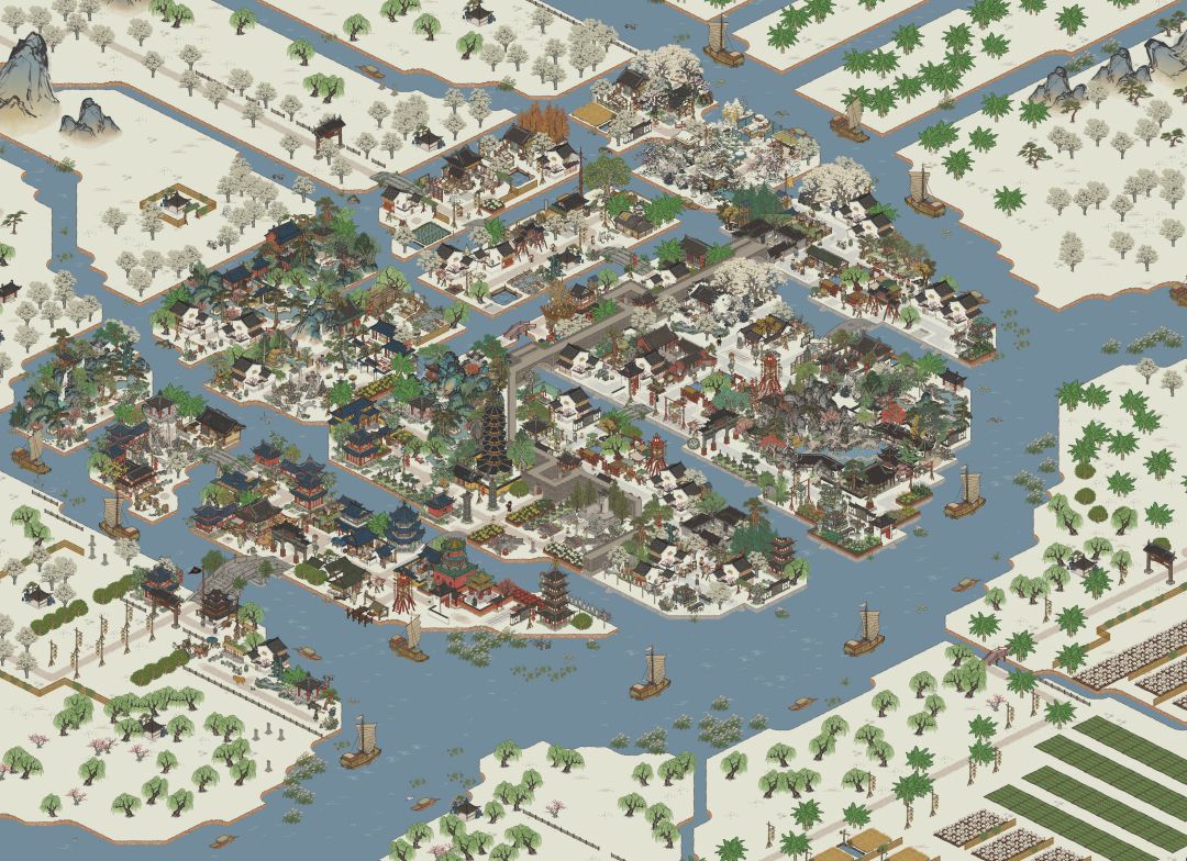 由于白玉兰的存在,以及制鞋坊和标布作坊在5级之后自带白玉兰,所以松江府可以说是最适合做雪景布局的地图,因此布局时候的基调是这样的:先把豫园抄作业,然后龙华塔抄作业,龙门径抄作业,然后布置雪景,最后慢慢填充其他部分。