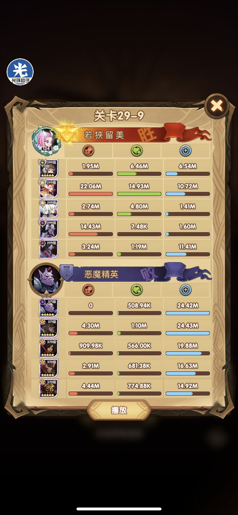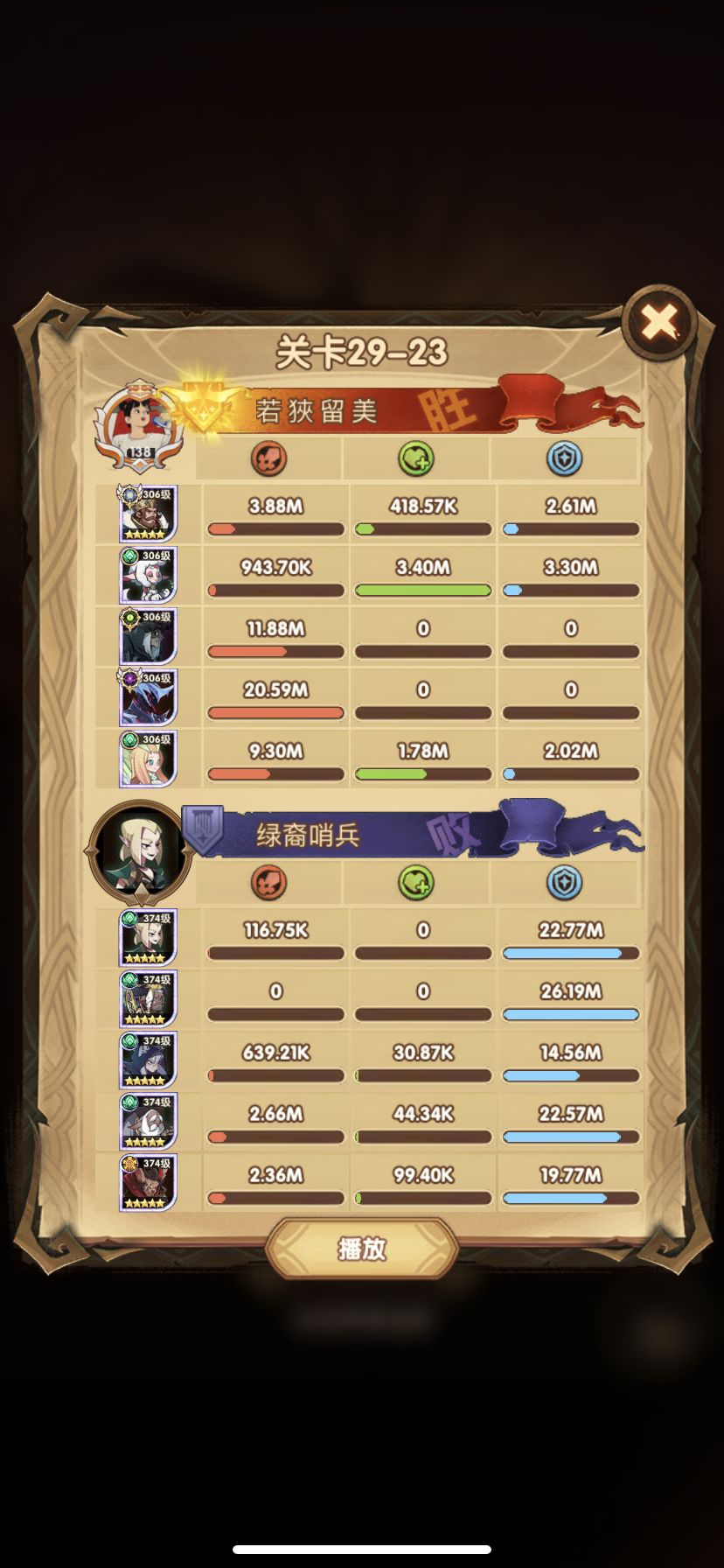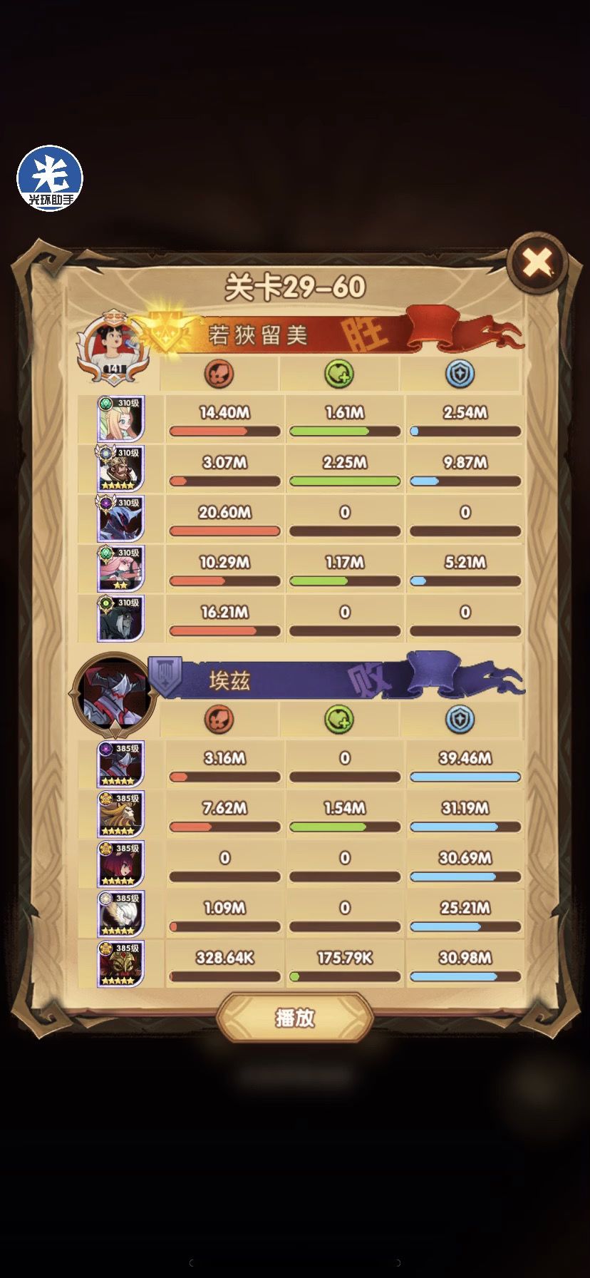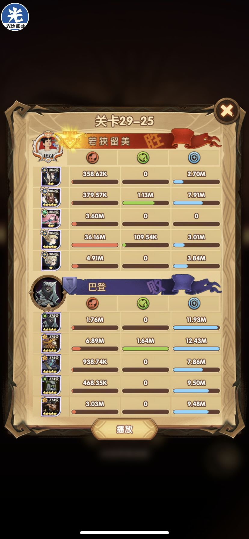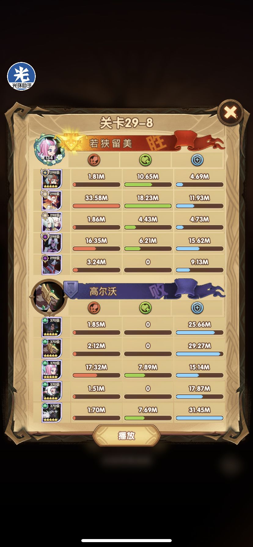 29-36 这关,龙弓3个平A,9秒钟结束战斗,没开大招。