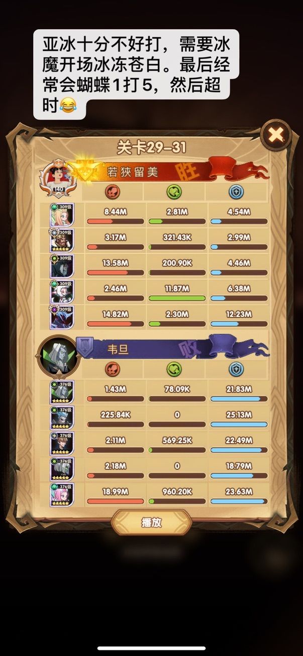 后来刷团本实在是无聊,正好冰魔也成型,就试了一下冰魔控制队,瞬间感觉到了推图的快乐😂😂 于是后来就决定不再用能量队,后面连商人也决定不上了,因为31-4后面多队推图的时候,商人只有一个。