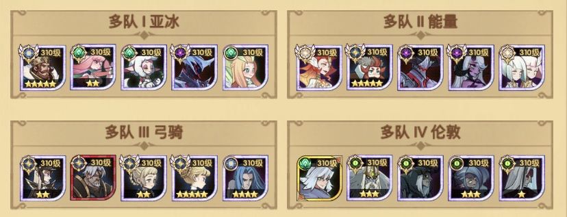 🔹 当然,实际情况还是要根据对方阵容来进行调整,不存在固定的搭配。多队阵容只是作为发展方向的参考,能够清晰地看到自己需要发展那些英雄。