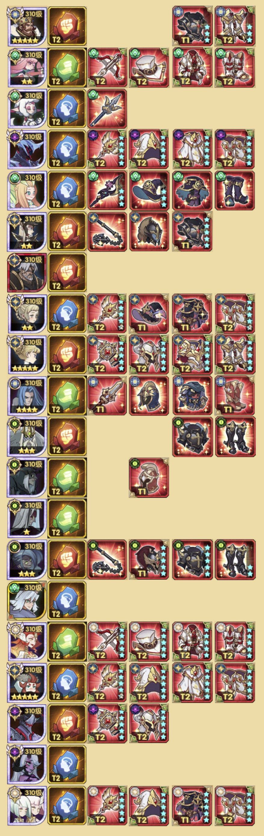 下面是我目前的装备情况,按照上面提到的四队规划排列。缺口最大的是亡灵的敏捷(骨弓轮子)、耀光的力量(女骑木盾)和恶魔的智力(魅魔/冰魔)。