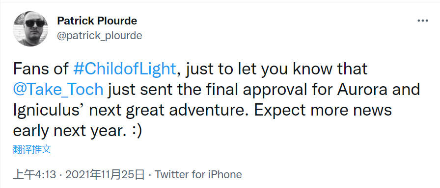 根据《光之子》游戏总监Patrick Plourde的推文,平台/回合制RPG《光之子》的续作有望在明年公布。